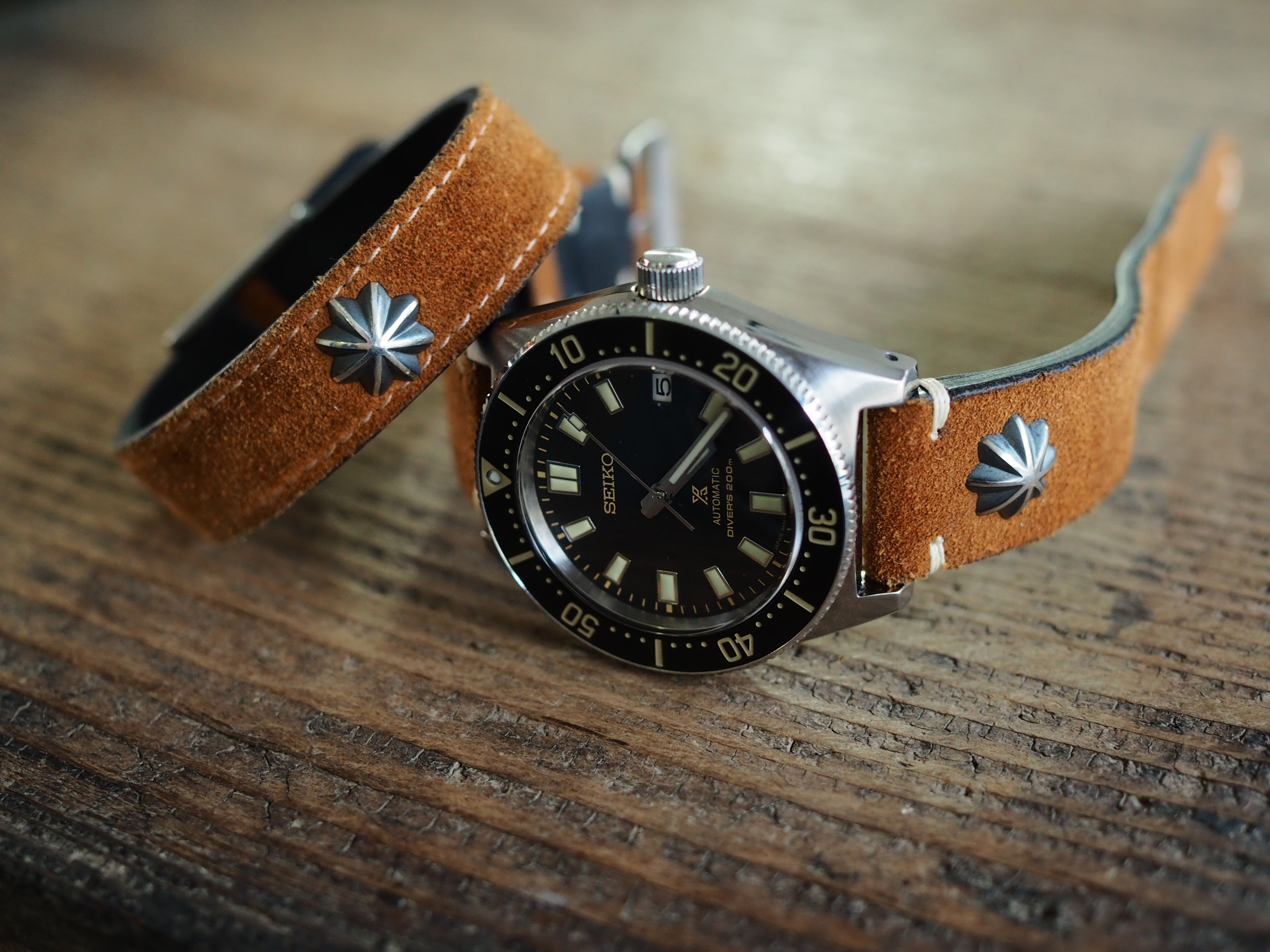 次はキャメルブラウン。当店唯一のスエードモデルで、私が愛してやまない革の一つです。イギリスのC・F・STEAD社が製造する「スーパーバック」と呼ばれるスエードで、他社のスエードに比べ毛足が短くキメが細かく目の詰まった上質な起毛が特徴。特にこのキャメルブラウンは、スエードらしいラフでビンテージな雰囲気を持ちながらどこか上品さも感じられ、シルバーコンチョとの相性も抜群。ミリタリーウォッチやダイバーズウォッチ等のツールウォッチとの相性が特にいいと感じています。