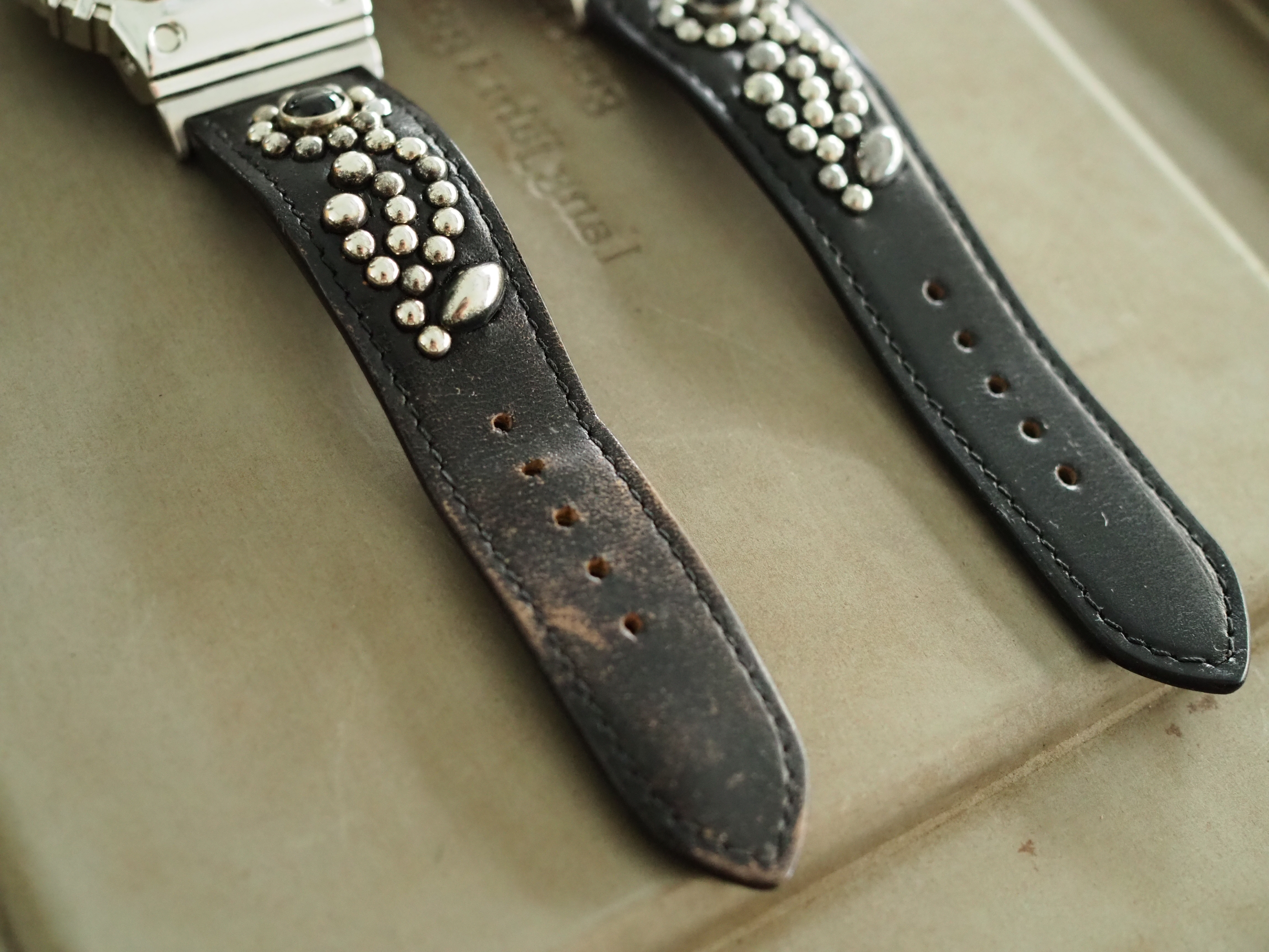 またベルト裏面にはスタッズの爪はもちろんのこと縫い糸すら露出していません。こうすることで時計着用時にスタッズの爪が肌に当たらないので着用感が損なわれず、同時に糸が汗を吸い革内部の劣化を早めることも防ぎます。既製品のベルトにスタッズなどを打ち込んで作る模倣品もあるようですが、そういった簡易な作り方では決してこうはならず、仕上がりも着用感も全くの別物ですのでご注意ください。